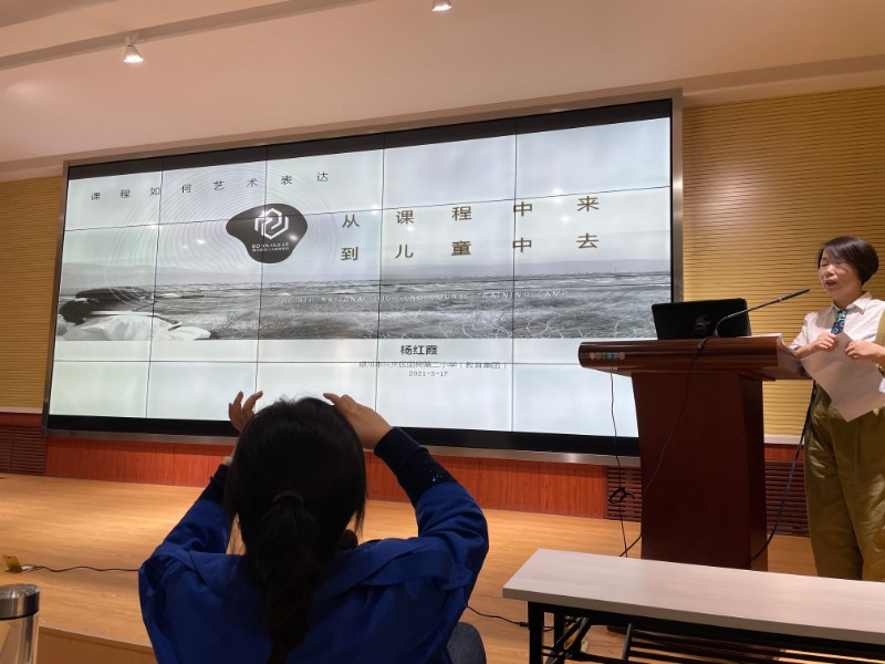 活动伊始,银川市兴庆区回民第二小学艺术总监杨红霞老师播放了回民二小所承办的“万物启蒙”课程成果艺术展视频,展览以“山河稚子”为主题,让孩子搭上有温度的艺术翅膀,走进世界,用心感受世间万物。同时,杨老师以“从课程中来 到课程中去”为题,阐述了“万物启蒙”课程艺术表达的方向与内涵;艺术展览的举办旨在让孩子用多样的当代材料,融合当代的形式,表现当代的思考,促使课程成果的艺术化。